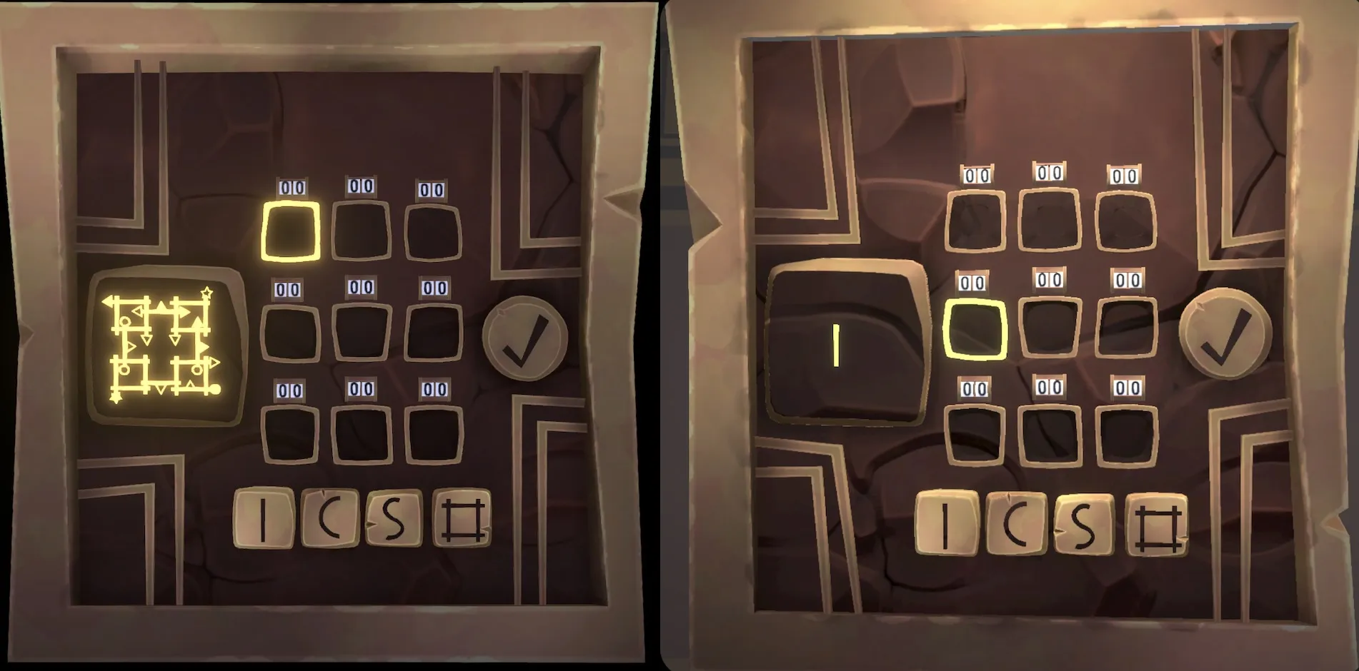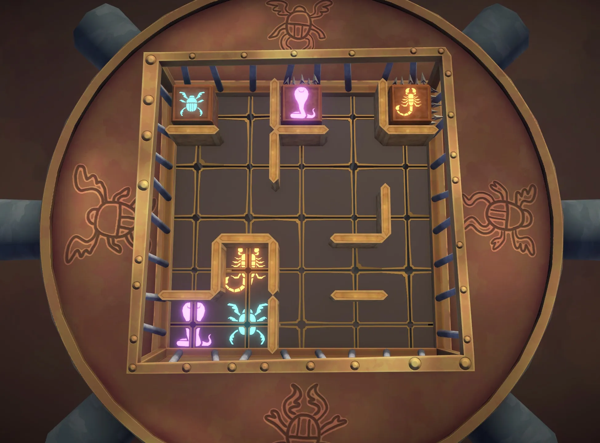 Outside the bounds of the tile puzzles are small scarab cages. These are a series of rotational sliding block puzzles, where rotating a board causes all the blocks to fall in the new “down” direction. These puzzles remained a little simpler when compared to the tiles above, so they made for nice intermezzos between the more challenging sections.